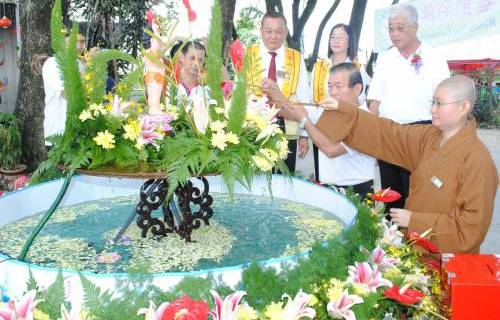 妙森法师(右)与林峰成一起主持浴佛;后排右:彭文宝,后排右3:林汶阶。