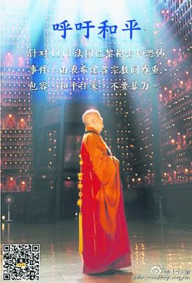星云大师关切巴黎恐袭事件,他在官方微博贴文呼吁和平。(图:微博)