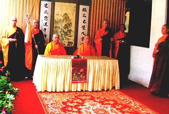 以上图片:(左)在马佛总主席日恒法师的见证下,传超法师就任竹林双庆禅寺住持。(右)庄严的升座礼,传超法师接下传承法脉的重任。