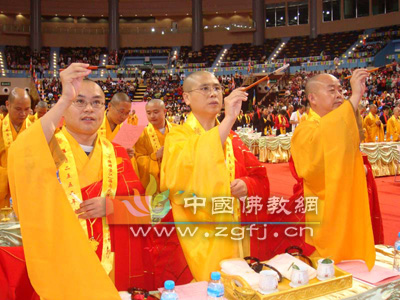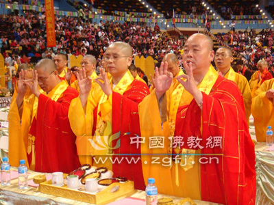 (中国讯) 2008年11月8日,澳门‘千佛耀濠江’海内外佛教界大供天祈福法会在澳门东亚体育馆隆重举行。澳门特别行政区长官何厚华、国务院宗教事务局蒋坚勇局长等高官出席法会。 本次活动由中华宗教文化交流协会、澳门佛教中心协会、香港文汇报共同主办,来自大陆、香港、澳门、台湾省、新加坡、印尼、澳大利亚的诸山长老、大德法师主礼法会。圣辉长老、净良长老、绍根长老、慧雄长老、莲海长老、戒晟法师、则悟法师、耀智法师、常藏法师、心平法师等在主席台就座。来自港澳的五千余名信众观礼和随喜了法会。天津佛协副会长、荐福观音寺住持妙贤法师应邀参加了在澳门的法会活动。