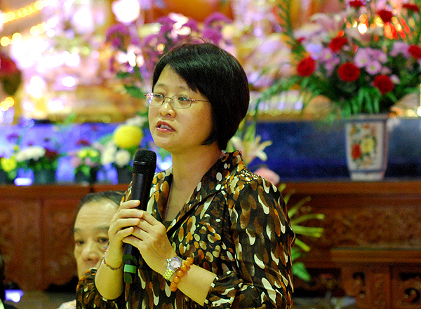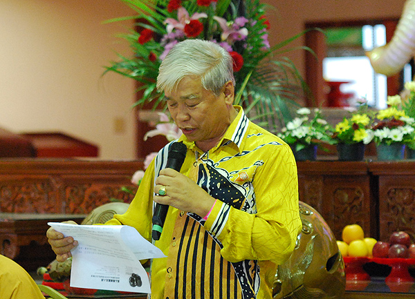 左起:慧律法师、筹委会主席刘长发居士、大会的名誉主席拿汀斯里卢翠婷太平局绅,大会主席蔡明田居士,贵宾马华妇女组全国主席拿汀巴杜卡周美芬。