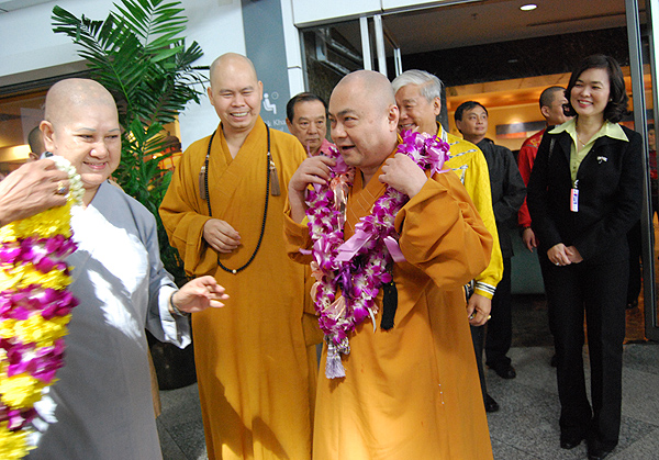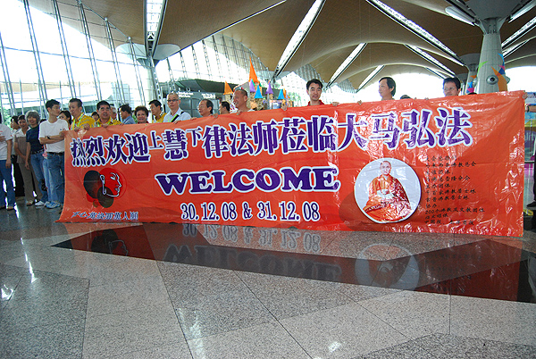 当慧律法师抵达吉隆坡国际机场,主办当局为慧律法师带上花环以示恭迎。